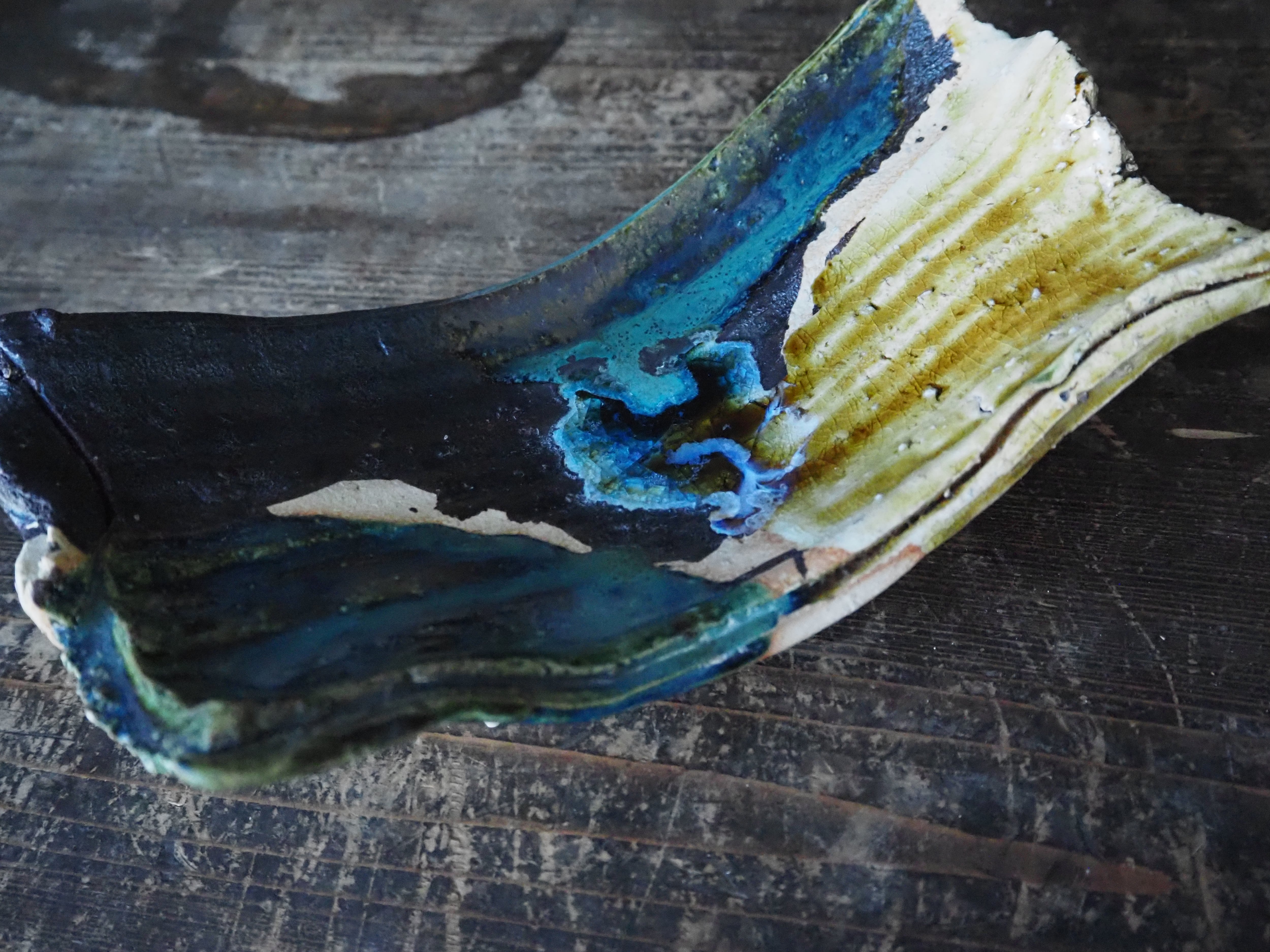 三色織部・変形長皿